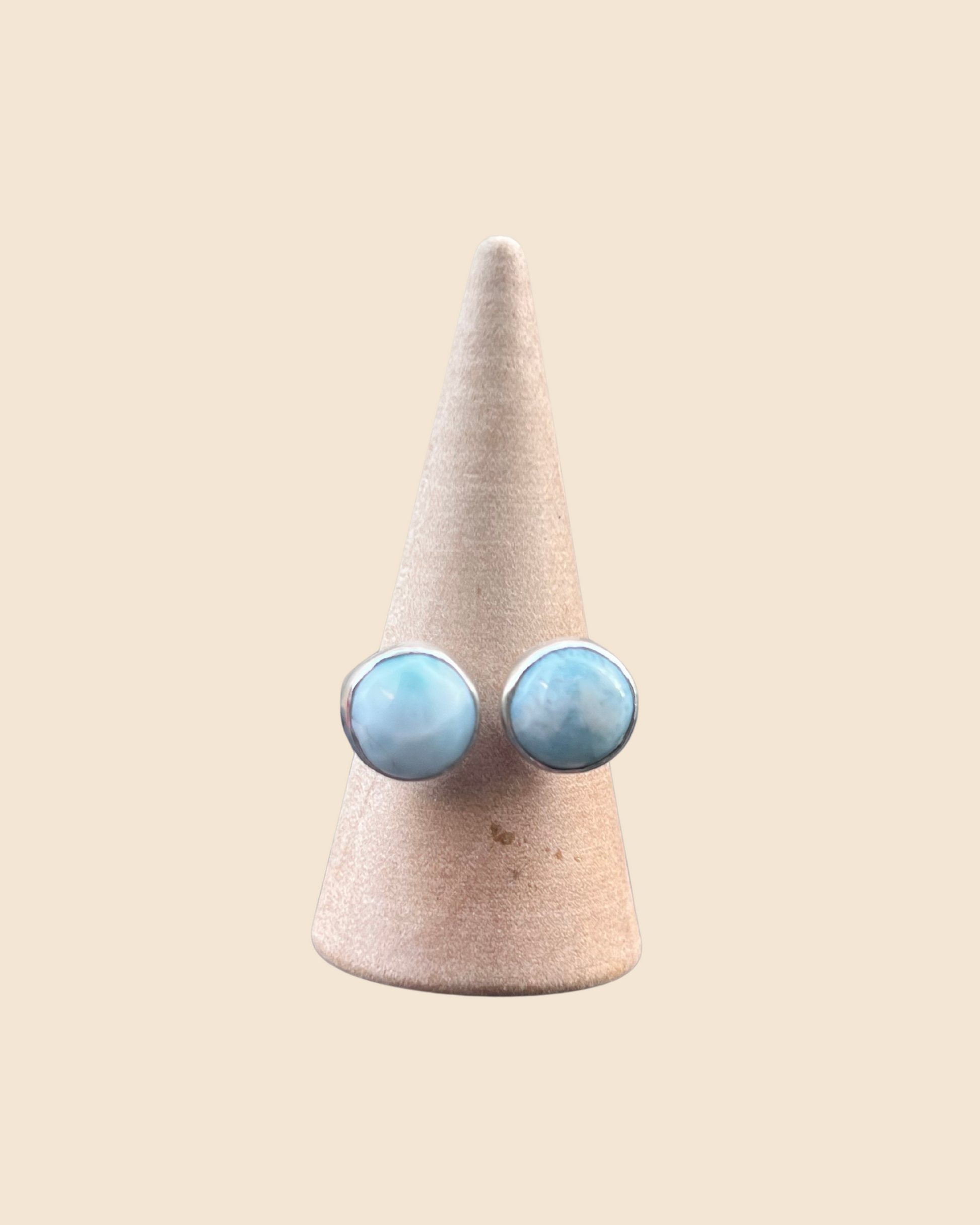 This handmade sterling silver ring features two circular Larimar stones set side by side with a slight gap in between. Each stone is framed in a smooth, plain bezel that highlights the natural blue tones, while the simple band keeps the design clean and balanced. The twin stones create a modern, eye-catching look that feels both unique and versatile. Each ring is one of a kind, crafted by hand with care and attention to detail—made to be treasured and worn with intention.