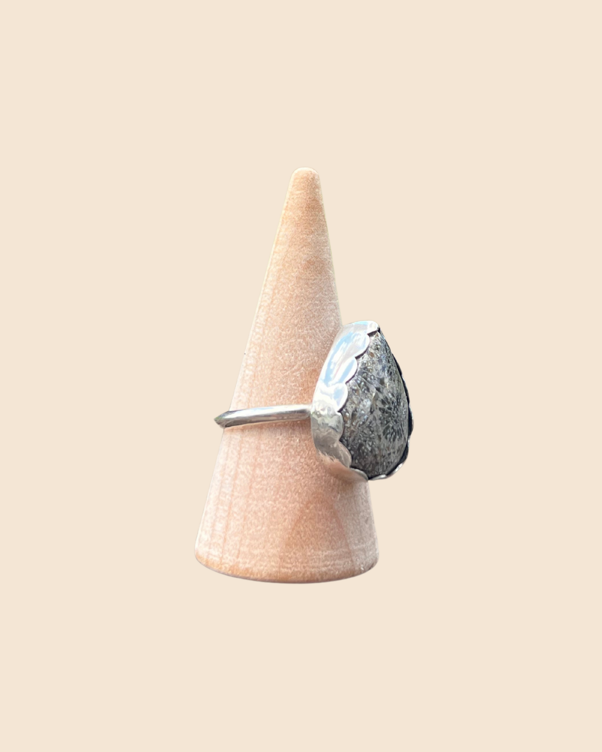 This handmade sterling silver ring features a natural fossil stone in a pear-shaped cut, set in a soft scalloped bezel. The stone’s earthy texture is balanced by a dainty, minimal band that keeps the focus on its ancient beauty. Each ring is one of a kind, crafted by hand with care and attention to detail—made to be treasured and worn with intention.