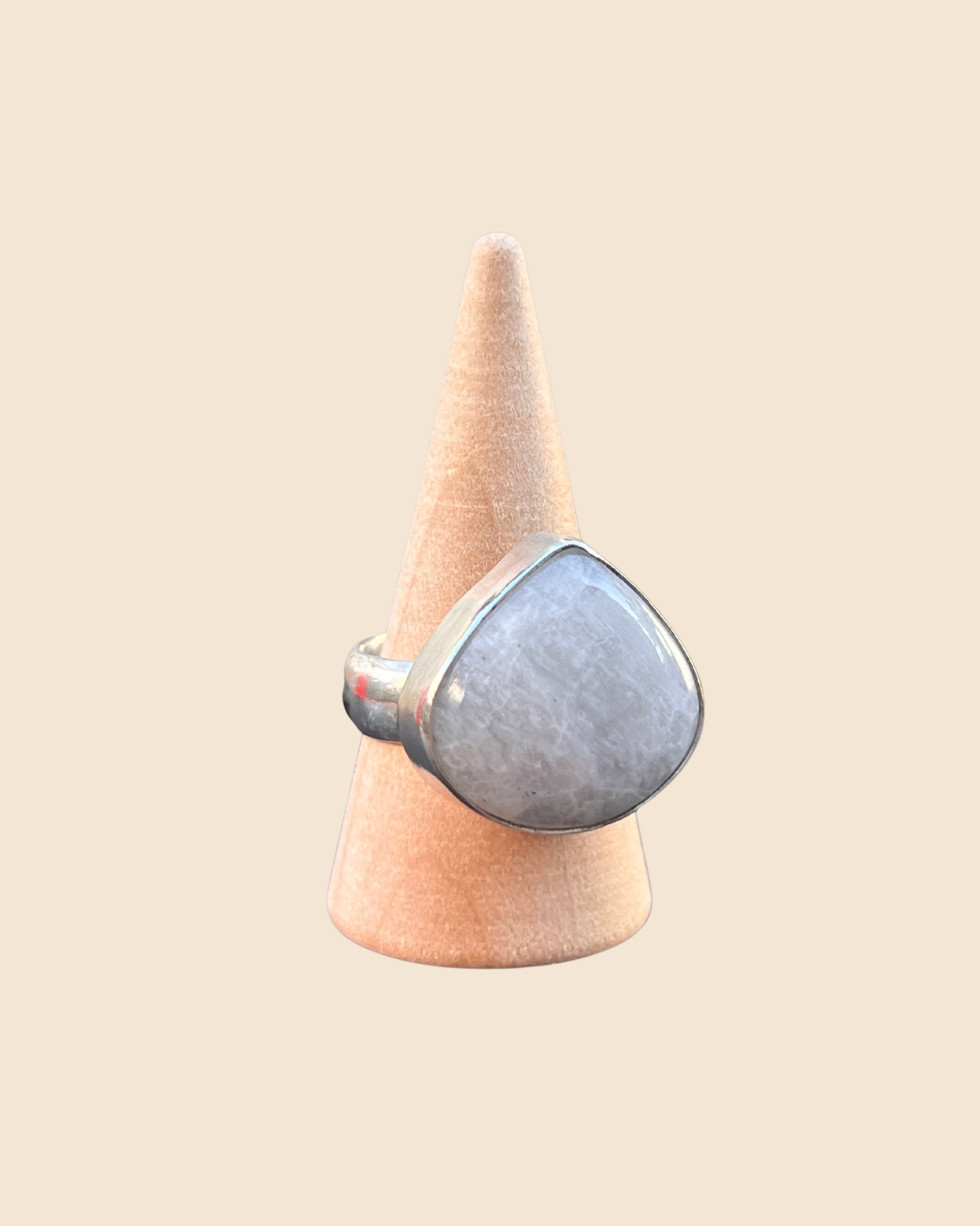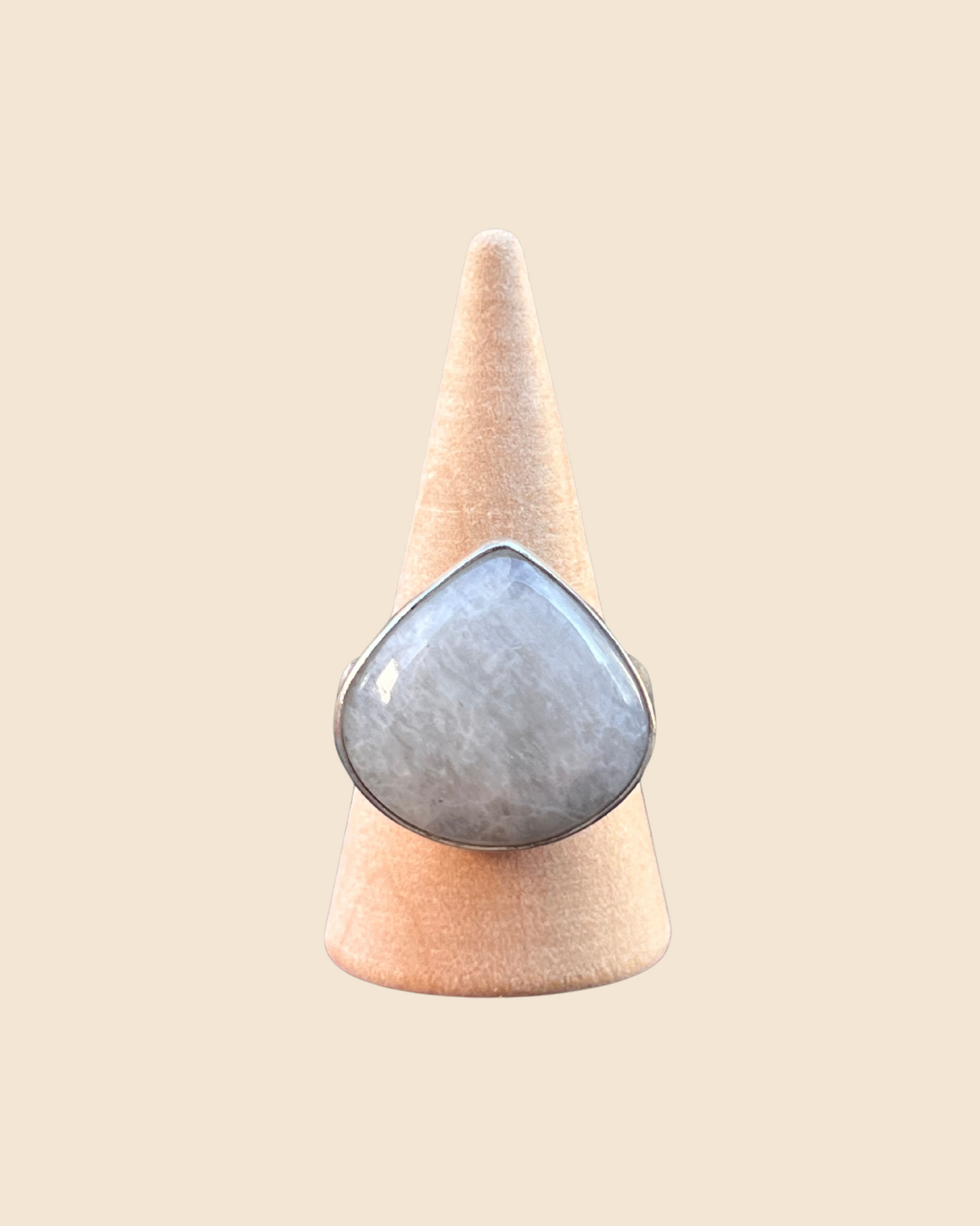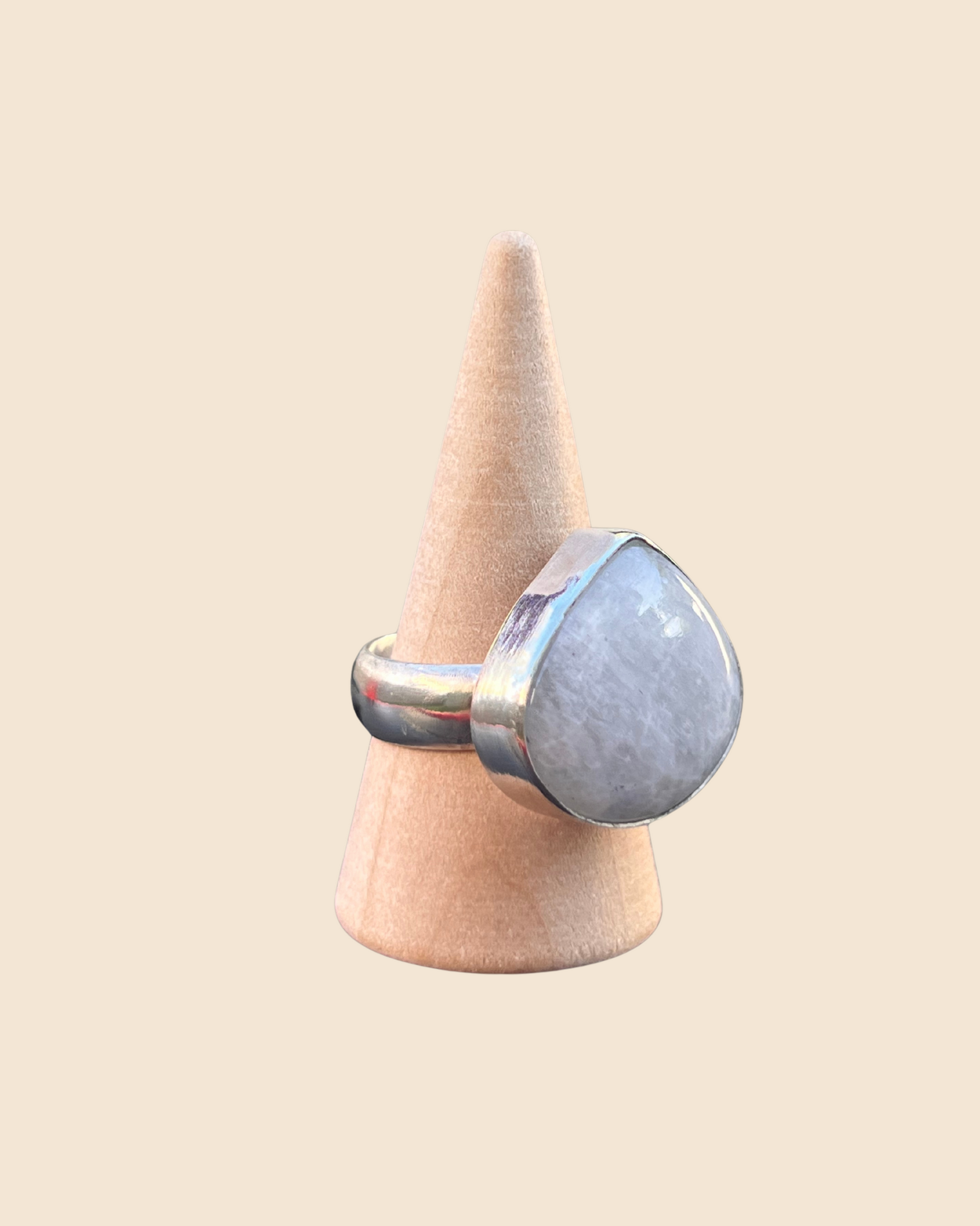 This handmade sterling silver ring features a pear-shaped moonstone with a smooth, plain bezel that showcases the stone’s natural play of light and subtle shimmer. The thick, chunky band adds a modern, bold touch while keeping the focus on the elegant moonstone. Each ring is one of a kind, crafted by hand with care and attention to detail—made to be treasured and worn with intention.
